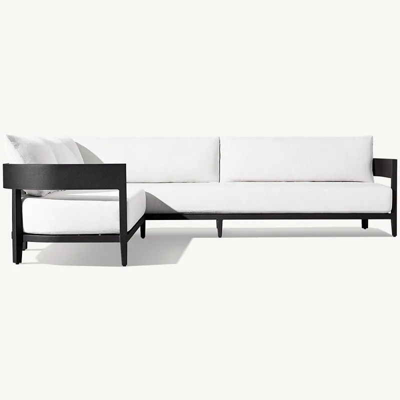 Наш відкритий металевий секційний диван виготовлено з алюмінію преміум-класу, відомого своєю винятковою міцністю та стійкістю до іржі та корозії. Це робить його ідеальним для використання за будь-яких погодних умов, гарантуючи, що ваші інвестиції виглядатимуть чудово з року в рік. Витончений сучасний дизайн алюмінієвої рами забезпечує витончений вигляд, який доповнює будь-який зовнішній декор, органічно поєднуючись із ландшафтом вашого саду.